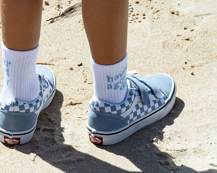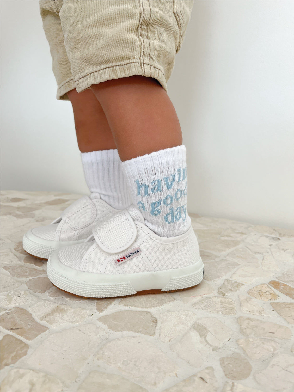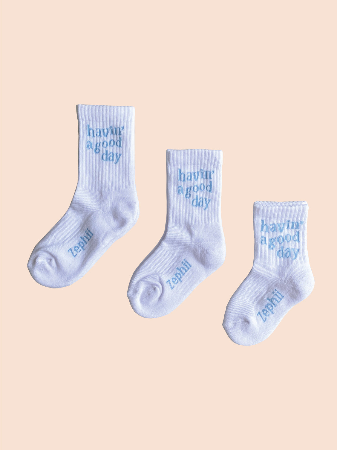 Havin' a good day socks are made for comfort for your little ones with a terry cotton base, ribbed crew length style + radiates the good vibes.